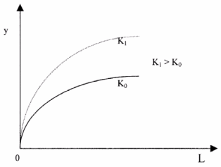 Каждое увеличение количественного параметра имущественного капитала означает смещение кривой вверх и одновременного увеличения предельной производительности труда при заданном количестве рабочей силы, т.е. на основе вытекающего непосредственно из описанного вывода означает и более высокую величину выпуска при увеличении производственного фактора «труд»: кривая OK1 на рисунке показывает более крутой наклон по сравнению с кривой OK0 при любом числе занятых трудом.