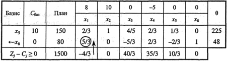 .Вибирають найменше значення 6, яке вказує на змінну, що виводиться з базису. Припустимо, що це виконується для
