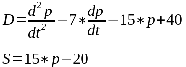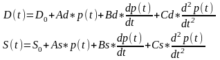 Попит D та пропозиція S як функції змінної в часі ціни p=F(t) та її похідних задаються виразами