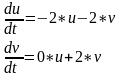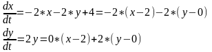 Cистема характеристичних рівнянь 1‑го наближення ряду Тейлора відносно точки (x=2, y=0) має вигляд: