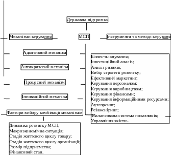 Економічна стійкість МСП визначається комплексним впливом факторів зовнішнього й внутрішнього середовища фірми. Стійке функціонування МСП забезпечується оптимальним сполученням всіх цих факторів. Одним з факторів, що перешкоджають розвитку малого бізнесу є низький рівень менеджменту. У цьому зв'язку для забезпечення економічної стійкості МСП необхідне вдосконалювання підходів, методів і інструментів керування, їхня адаптація до специфіки малого й середнього бізнесу [4]. Досить ефективним є використання для цих цілей комбінації різних механізмів керування: адаптивного, процесного, антикризового й інноваційного.