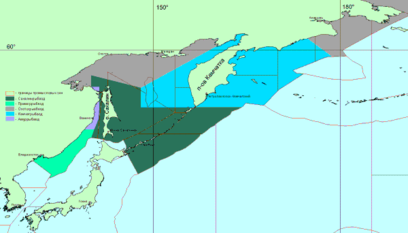 Различными цветами выделены зоны ответственности региональных Управлений по охране и воспроизводству рыбных запасов (Рыбводов). (В настоящее время эти функции переданы ФПС и региональным управлениям Россельхознадзора). Они примерно соответствуют прилегающим к субъектам Федерации Дальневосточного федерального округа (ДФО) морским акваториям, на которые теоретически распространяется преимущественное право этих субъектов Федерации. Эта "теоретическое право" следует из статей 9 и 72 Конституции РФ, согласно которым природные ресурсы территорий являются основой жизнедеятельности населения, проживающего на этой территории. Согласно российскому законодательству водные биоресурсы (ВБР) ИЭЗ являются федеральной собственностью, поэтому управляет ВБР ИЭЗ федеральное Правительство при участии администраций регионов.