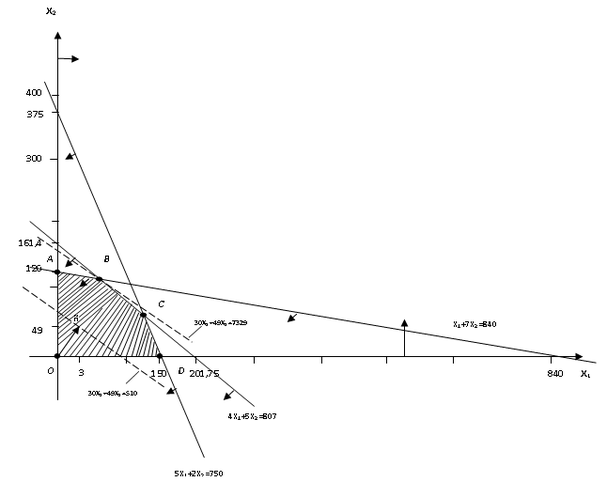 Как видно из рис №1, многоугольником решений является пятиугольник OABCD. Координаты любой точки, принадлежащей этому пятиугольнику, удовлетворяют данной системе неравенств и условию неотрицательности переменных. Поэтому сформулированная задача будет решена, если мы сможем найти точку, принадлежащую пятиугольнику OABCD, в которой функция F принимает максимальное значение.