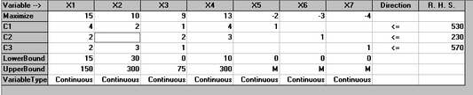 В строках С1, С2, С3 — названия ограничений. В соответствующих строках вводятся коэффициенты этих ограничений, за которыми следуют их знаки (в столбце Direction) и правые части (в столбце R. Н. S.). Это норма расхода ресурсов на единицу производимой продукции с использованием конкретного ресурса при наличии этих ресурсов.