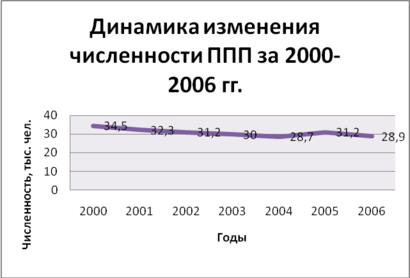 По графику видно, что численность работников в периоде 2000-2004 гг. постепенно уменьшалась каждый год соответственно на 2, 1, 1 и 1 тысячу человек. В 2005 году происходит резкое увеличение численности на 2 тысячи человек (это связано с увеличением численности работников в сфере малого предпринимательства на транспорте) и к 2006 году снова спад на тысячу человек. Самое большое число работников на предприятии – 34, 5 тысячи человек было в 2000 году.