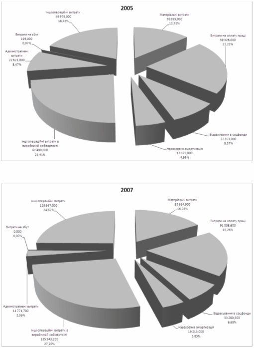 зниженням структурної частки витрат на оплату праці з рівня 30,59% (22,22%+8,37%) у 2005 році до рівня 24,94% (18,26%+6,68%) у 2007 році.
