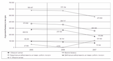 Рис.2.1. – Динаміка змін абсолютних обсягів характерних агрегатів балансу ВАТ «Дніпропетровськгаз» у 2005 –2007 роках