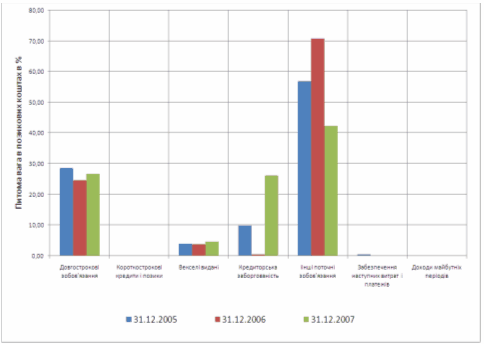 поступовим зниженням обсягів високоліквідних та короткострокових готівкових коштів та відповідними зниженням рівня коефіцієнта строкової ліквідності з 0,85 (2005 рік) – 0,63(2007 рік) при нормативному значенні не менше 0,7 – 0,8;
