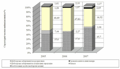 Таким чином, падіння структурної частки запасів та дебіторської заборгованості в валюті активів балансу зумовлене у 2005 2007 роках зростанням структурної частки необоротних активів.