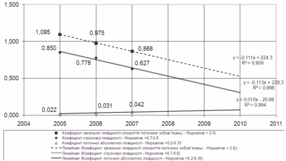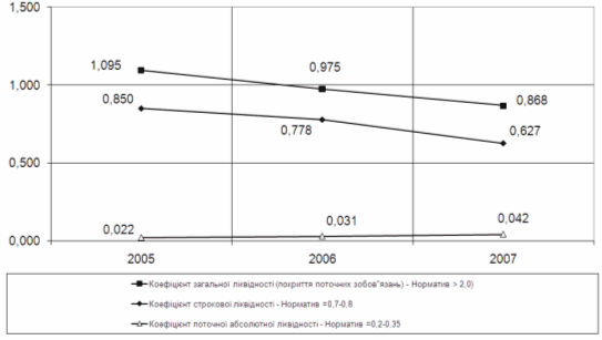 поступовим зниженням обсягів ліквідних коштів та відповідним зниженням рівня коефіцієнта загальної ліквідності з рівня 1,095 (2005 рік) до рівня 0,868(2007 рік) при нормативному значенні не менше 1,5 – 2,0, що відмічалось вище в аналізі як невідповідність власного та довгострокового капіталу і обсягів необоротних коштів;