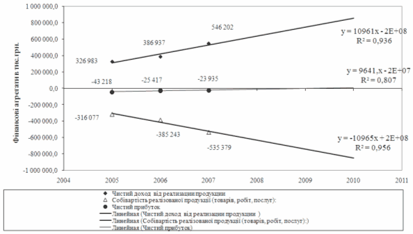 Рис.3.1. Прогнозування обсягів реалізації, собівартості та чистого прибутку ВАТ «Дніпропетровськгаз» на період 2008 2010 років на основі кореляційно –регресійної економіко-математичної моделі діяльності ВАТ у 2005 2007 роках (лінійна модель прогнозу)