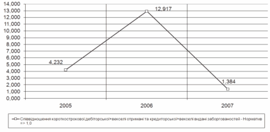 3) структурна частка кредиторської заборгованості в валюті балансу з рівня 8,2% у 2005 році зросла до рівня 22,4% у 2007 році, що свідчить про розширення використання підприємством комерційного кредиту постачальників, ;