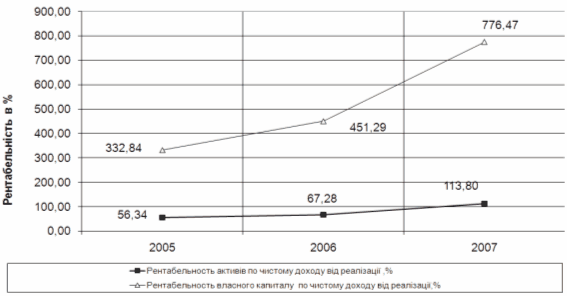 постійним зростанням рівня рентабельності активів по чистому доходу від реалізації продукції з рівня 56,3% у 2005 році до рівня 113,8% у 2007 році;
