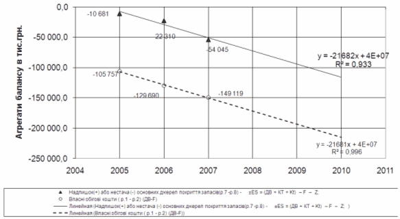 Рис.3.4. Прогнозування обсягів дефіциту ліквідності в ВАТ «Дніпропетровськгаз» на період 2008 2010 років на основі кореляційно –регресійної економіко-математичної моделі діяльності ВАТ у 2005 2007 роках (лінійна модель прогнозу)