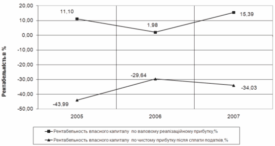 зниженням рівня реалізаційної рентабельності власного капіталу з рівня 11,1% (2005 рік) до 1,98%(2006 рік) та зростанням до 15,4% (2007 рік);