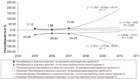 Прогнозування рівня рентабельності власного капіталу ВАТ «Дніпропетровськгаз» на період 2008 2010 років на основі кореляційно –регресійної економіко-математичної моделі діяльності ВАТ у 2005 2007 роках (лінійні та нелінійні моделі прогнозу) – рис.3.2;