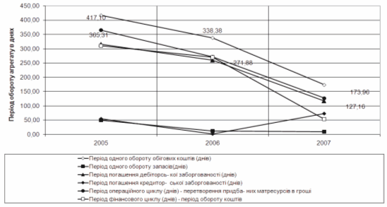зниженням на 15 – 20% періоду обороту основних агрегатів активів підприємства у 2006 році відносно рівня 2005 року та подальшим зниженням на 3540% періоду обороту активів у 2007 році відносно рівня 2006 року, що свідчить про зростання рівня ділової активності підприємства при зростанні обсягів валюти балансу (рис.2.9);