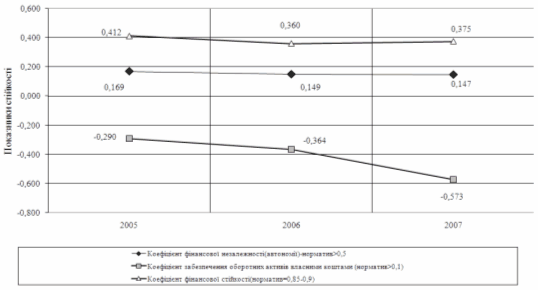 знаходження показника фінансової незалежності (автономії) у 2005 2007 роках в діапазоні 0,15 – 0,17, що не відповідає вимогам до стійкого функціонування підприємства (коефіцієнт автономії > 0,5) та , одночасно, фіксує занадто великий рівень застосування фінансового важеля залучених поточних коштів в розрахунках, що може спричинити неплатоспроможність та ризик банкрутства підприємства за вимогами кредиторів;