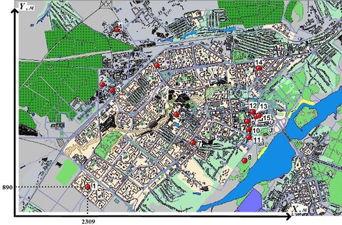 Расположение поставщиков (производителей) и клиентов (потребителей) минеральной воды определим с помощью «Липецкой информационной системы» (ЛИС). Масштаб выберем как показано на рисунке 1. Осями координат будут края видимой части карты города. Левый край – ось Y, нижний – ось X. Все точки поставщиков и клиентов прономеруем.