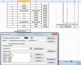 В модуле «Поиск решения» устанавливаем целевую ячейку равную минимальному значению и соответствующие ограничения (рисунок 2). В качестве формулы целевой функции будем использовать функцию «СУММПРОИЗВ», которая перемножает соответствующие элементы заданных массивов и возвращает сумму произведений.