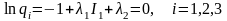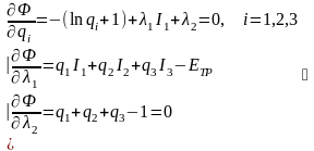 Затем определяют частные производные по qi, λ1 и λ2, которые приравнивают к нулю, т.е.