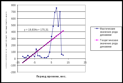 Колеблемость от теоретической прямой составляет 213,18 рублей или 335%. Так как коэффициент вариации много больше 30%, значения ряда динамики не однородны.