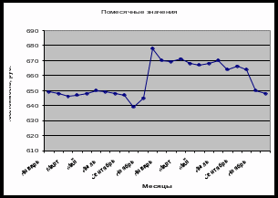 Построим ряд динамики помесячных значений себестоимости единицы продукции. За колебаниями ежемесячных значений может не просматриваться общая тенденция динамики, поэтому для её выявления воспользуемся следующими статистическими методами: