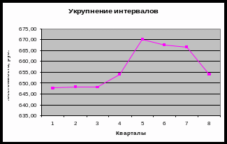 - Укрупнение интервалов. Рассматриваемый период разобьем на 8 интервалов – кварталов. Укрупненные кварталы представлены в приложении В. Построим 2 графика по помесячным значениям себестоимости и по укрупненным интервалам.