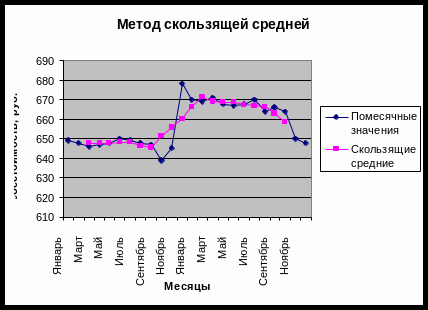 - Метод скользящей средней. Суть метода состоит в замене абсолютных данных средними арифметическими за определенные периоды. Расчет средних ведется способом скольжения, т.е. постепенным исключением из принятого периода скольжения первого уровня и включением следующего.