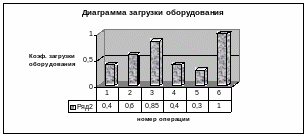 По результатам расчета коэффициента загрузки строится столбиковая диаграмма загрузки оборудования, которая дает наглядное представление о степени использования оборудования. По оси абцис откладываются номера операции, на которых занято оборудование, а по оси ординат – численное значение коэффициента загрузки. Высота столбика соответствует коэффициенту загрузки оборудования по каждой операции.