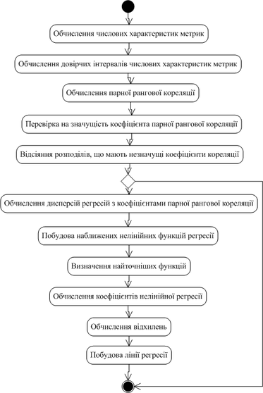 Статистичний аналіз, який виконується з метою визначення залежностей між метриками, складається з трьох етапів: первинний статистичний аналіз, кореляційний аналіз та регресійний аналіз.