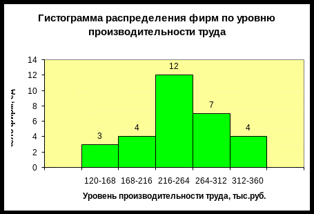 Вывод. Анализ интервального ряда распределения изучаемой совокупности организаций показывает, что распределение организаций по уровню производительности труда не является равномерным: преобладают организации с уровнем производительности труда от 216 до 264 тыс.руб. (это 12 организаций, доля которых составляет 40%); самая малочисленная группа организаций имеет уровень производительности труда от 120 до 168 тыс.руб., которая включает 3 организации, что составляет 10% от общего числа организаций.