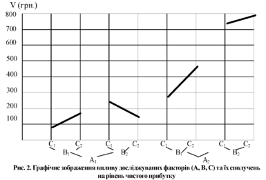 Рис. 3. Графічне зображення впливу досліджуваних факторів (А, В, С) та їх сполучень на рівень чистого прибутку