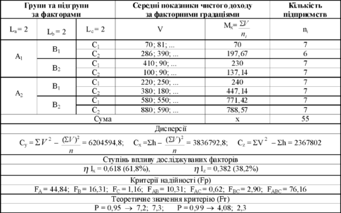 В основу розрахунку такого комплексу покладено комбінаційне групування 55 досліджуваних сільськогосподарських підприємств Полтавського регіону. Одержані кількісні характеристики дисперсійного аналізу орієнтують на наступні висновки:
