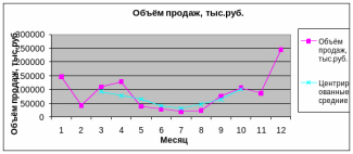 | Месяц | Объём продаж | Скользящие 4-х членные средние | Центрированные средние |