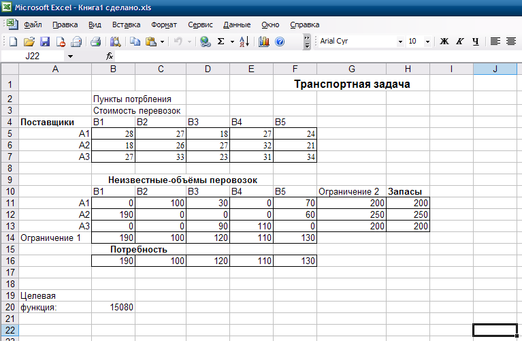 Также были применены возможности электронных таблиц MS Excel при решении транспортной задачи, получены оптимальные результаты, подтверждающие результат метода потенциалов.