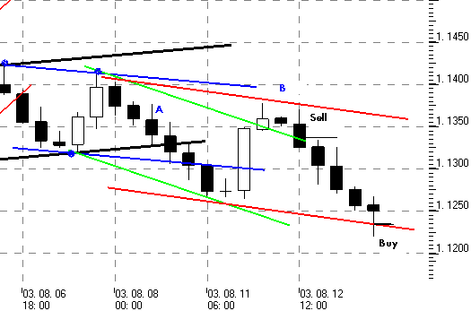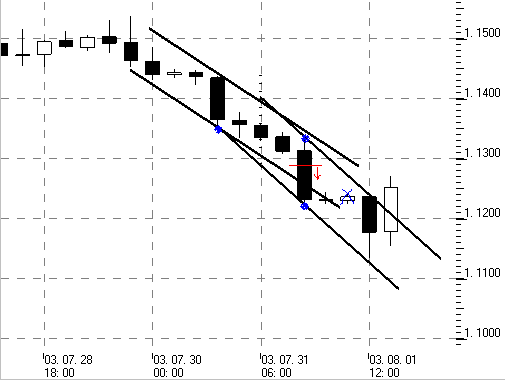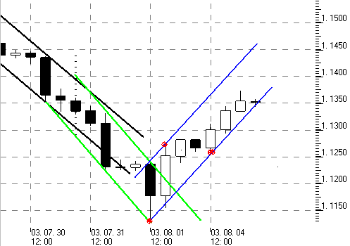 Графические построения - скользящие каналы. Каналы строятся по трем последним экстремумам - линия по двум низам и параллельная через вершину, или наоборот, линия по двум вершинам и параллельная по двум низам. Линии строятся ПО МАКСИМАЛЬНЫМ (МИНИМАЛЬНЫМ) ЗНАЧЕНИЯМ, то есть по теням свечей. Экстремум идентифицируется при не менее 2 свечек после его прохождения. Между соседними экстремумами не должно быть менее 2 свечей. Исключения - соседние максимумы - минимумы могут быть на концах одной длинной свечи.