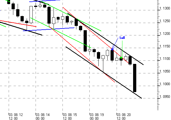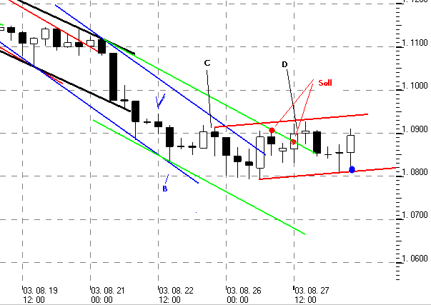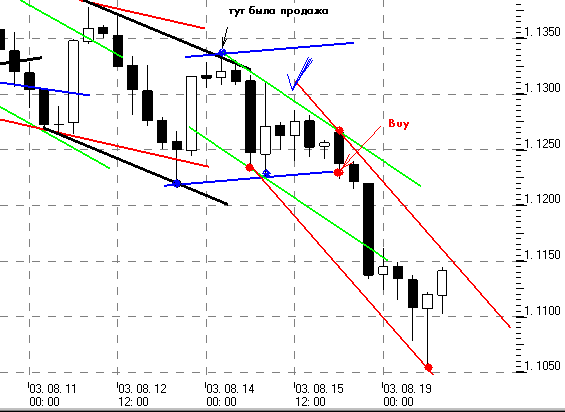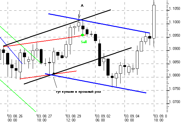 Цена так понеслась вверх, практически без откатов, что, поджимая ее на расстоянии 50 пунктов, подняли стоп до уровня 980. Там нас и закрывает на свечке А, профит составил 160 пунктов, а всего - 750. Еще действует красный канал, черного и синего еще нет, и, смешной случай!, приходится продавать в зеленой точке по цене 955 (какая разница, откуда достигнута граница канала!). Как оказалось - не напрасно. На следующей свечке вырисовывается черный канал, черная свечка так прошивает его, что мы успеваем перенести стоп четко на его границу и закрыться по цене 875. Опять прибыль 80 пипсов, а всего - +830. В той же точке нас открывает вверх, по стопу разворачивает вниз (я уже не рисую, сами посмотрите) на отметке 818, на отметке 760 мы компенсируем убыток, закрываясь по поджимающему стопу, рисуем синий канал, на его верхней границе продаем, длинная толстая свеча разворачивает нас вверх с убытком в 57 пунктов, но тут же возвращает их нам... Закончим на этом. Мы куплены с хорошими перспективами на будущее (сейчас то мы знаем, что первая неделя сентября началась сильным ростом евро).