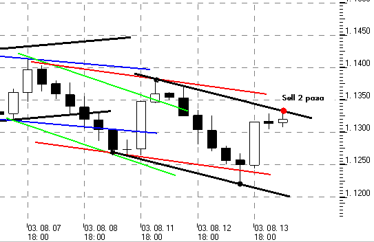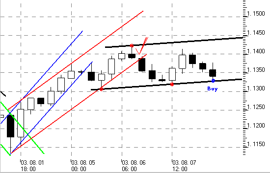 Открытие позиции - при достижении границы канала - внутрь канала. Единственное возможное отступление - при наличии явного тренда можно не открываться против него. Оценивает сам трейдер. Потери при этом несколько уменьшаются, но часто пропускаются очень хорошие разворотные движения рынка.