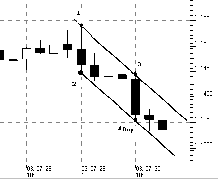 Появилась возможность нарисовать канал по точкам 1, 2, 3. В точке 4 - покупка по цене 1350. Стоп - 1293.