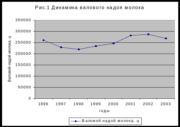 Диаграмма наглядно изображает изменение валового надоя молока в хозяйствах Орловской области: с 1996 по 1998г. валовой надой снижался, а с 1999г. стал заметно увеличиваться. Таким образом, к 2003 году валовой надой молока увеличился по сравнению с 1996 годом на 7029 ц.