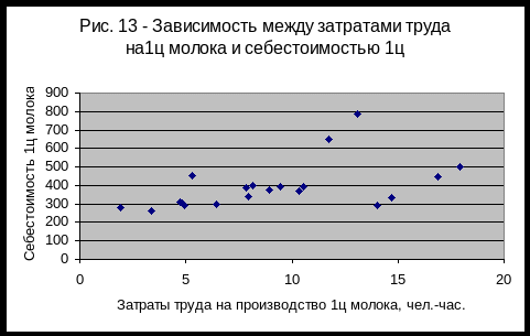 Коэффициент b 0, это подтверждает, что зависимость между затратами труда и себестоисотью 1ц молока прямая. При увеличении затрат труда на производство 1ц молока на 1 чел.-час, себестоимость 1ц молока увеличится на 14,38 руб.