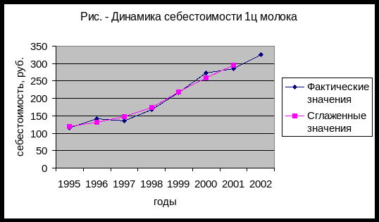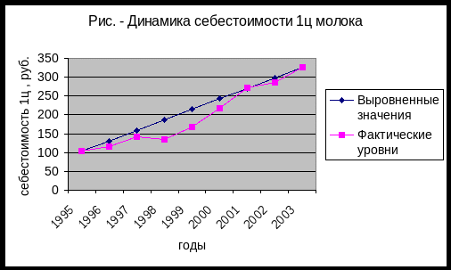 На основаниях данных таблицы 5 покажем на графике фактическую и выровненную себестоимость 1ц молока за изучаемый период.
