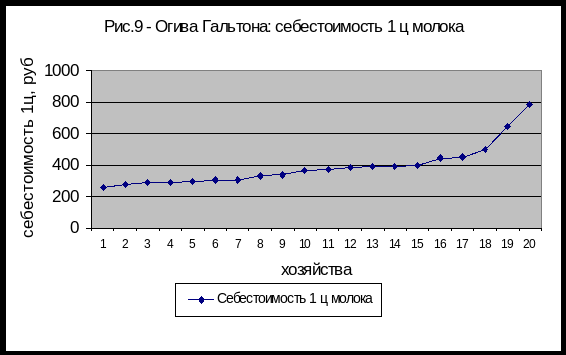 Таблица 12 – Распределение сельскохозяйственных предприятий по уровню себестоимости 1ц молока.