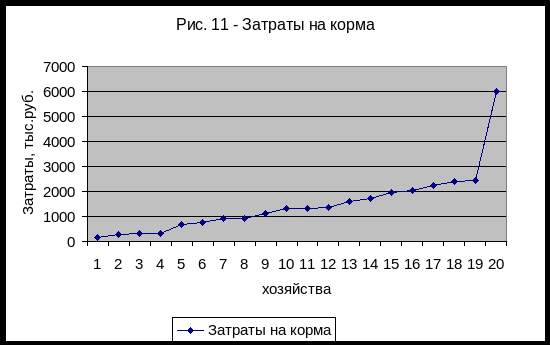 С увеличением затрат на корма, общие затраты, приходящиеся на 1 голову, также в среднем увеличиваются. Прямые затраты труда, приходящиеся на 1 гол. с увеличением затрат на корма, снижаются. Так, в 1 группе хозяйств, где затраты на корма самые низкие, затраты труда на 1 гол. выше, чем в 3 группе, где затраты на корма самые высокие, на 47%.