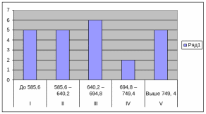 Как видно из таблицы 1.2 и рисунка 1.2, распределение предприятий по группам не равномерно. Преобладают хозяйства с ценой реализацией молока руб./ц., лежащие в интервале I,II,III и V. т.е. в интервалах до 585,6;от 585,5 до 694,8 и 749,4 и выше руб./ц. В группы с более низкой ценой реализации молока входит меньше хозяйств.