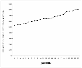 Для большей наглядности изобразим ранжированный ряд графически, для этого построим график, в котором на оси абсцисс укажем районы в ранжированном ряду, а на оси ординат - величину группировочного признака (рис.1.1)