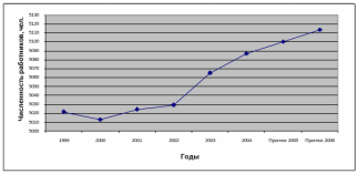 За указанные годы наблюдается незначительный рост среднесписочной численности работников: ежегодный рост составляет 11,0 чел. (среднегодовое значение абсолютного прироста) или 0,3% (среднегодовое значение темпа прироста). В итоге, за период с 1999г. по 2004г. рост численности работников составил с 5021,0 чел. до 5067,0 чел. или 1,3%. Прогнозная численность работников: в 2005г. составит 5100,3 чел. с учетом среднегодовых значений абсолютного прироста, в 2006г. – 5113,6 чел.