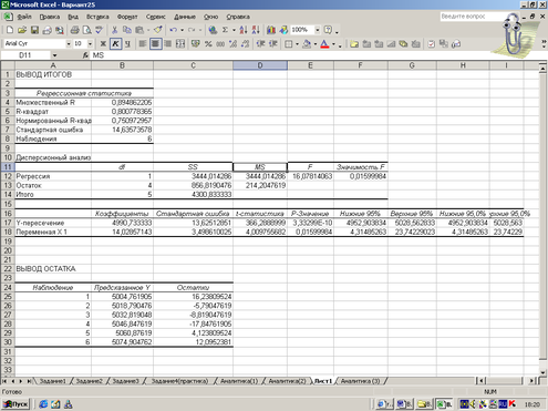 Рассчитаем параметры регрессии с помощью инструментария Excel (функции "Сервис" и "Анализ данных").