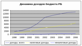Таким образом, кризисным годом для республиканского бюджета можно назвать 1998 год, когда большинство показателей были низкими. Однако и в настоящее время ни один из выше приведенных показателей нельзя отнести к стабильным, хотя в целом доходы бюджета за анализируемый период характеризуются ростом.
